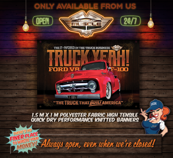 FORD F100 TRUCK YEAH FABRIC BANNER HOUSE OF MUSCLE 1.5M X 1M STRAIGHT TO THE POOL ROOM 100 CLUB THE TRUCK THAT BUILT AMERICA